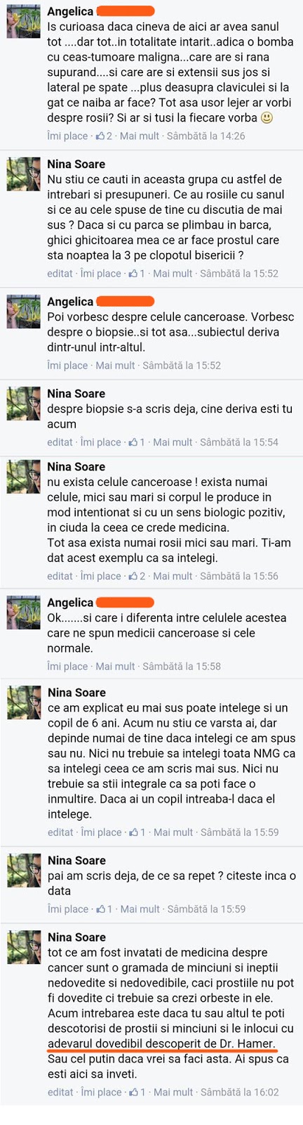 1. Angelica, diagnosticată cu cancer de sân probabil metastazat, care cerea în toamna anului 2015 ajutor pe grupul Noua Medicină Germanică (NMG).